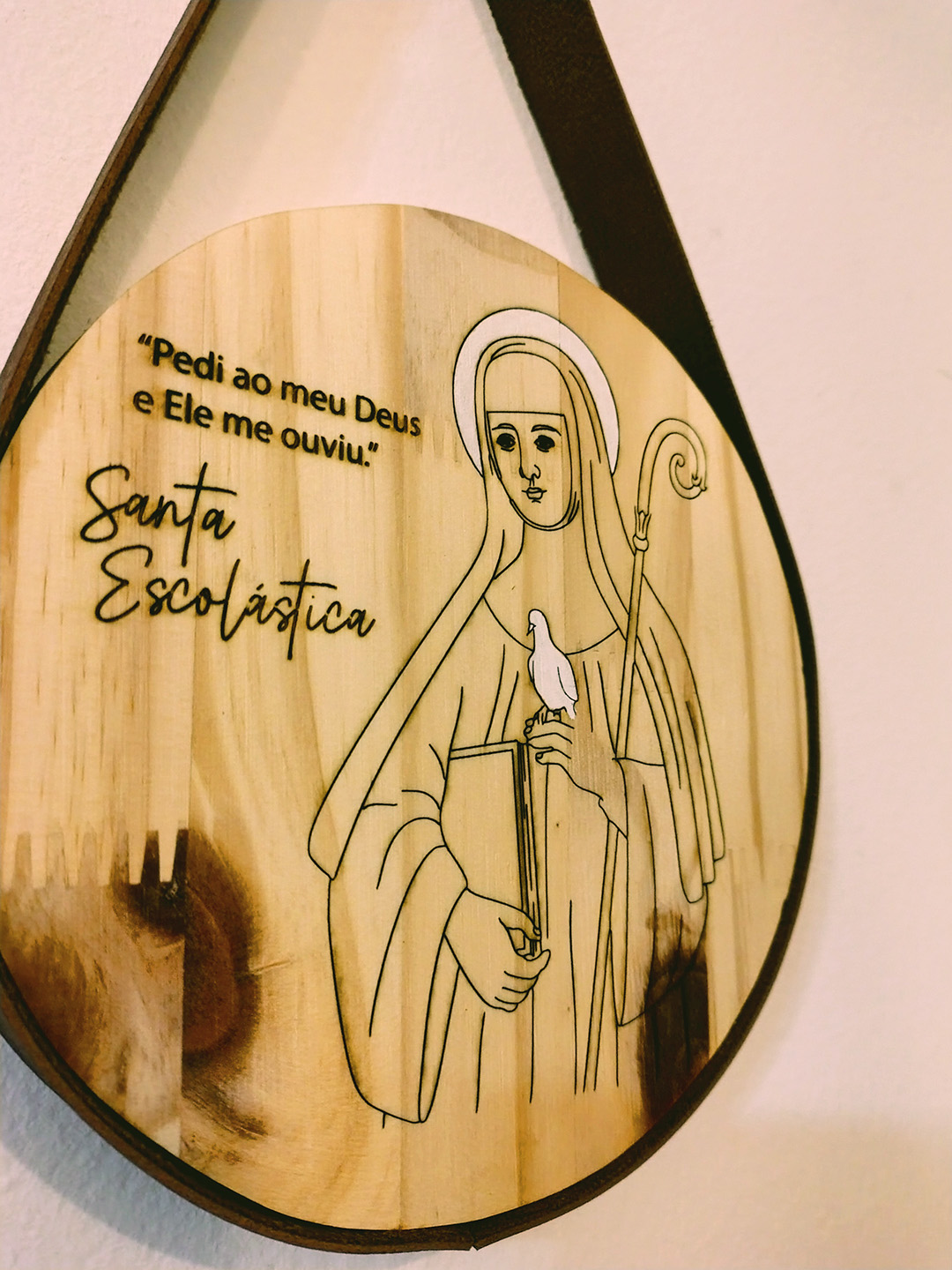Feito em madeira pinus, com gravação a laser e detalhes delicadamente pintados à mão. Alça em couro sintético, que confere elegante acabamento. Em cada quadro, uma lindíssima frase para refletir e se inspirar. Ideal para presentear e enriquecer sua devoção!