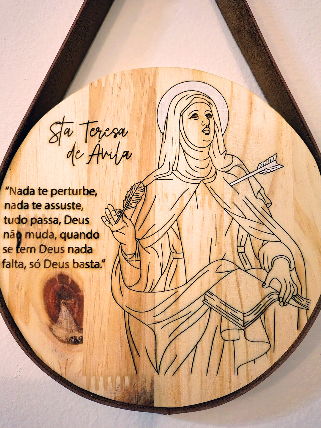 Feito em madeira pinus, com gravação a laser e detalhes delicadamente pintados à mão. Alça em couro sintético, que confere elegante acabamento. Em cada quadro, uma lindíssima frase para refletir e se inspirar. Ideal para presentear e enriquecer sua devoção!