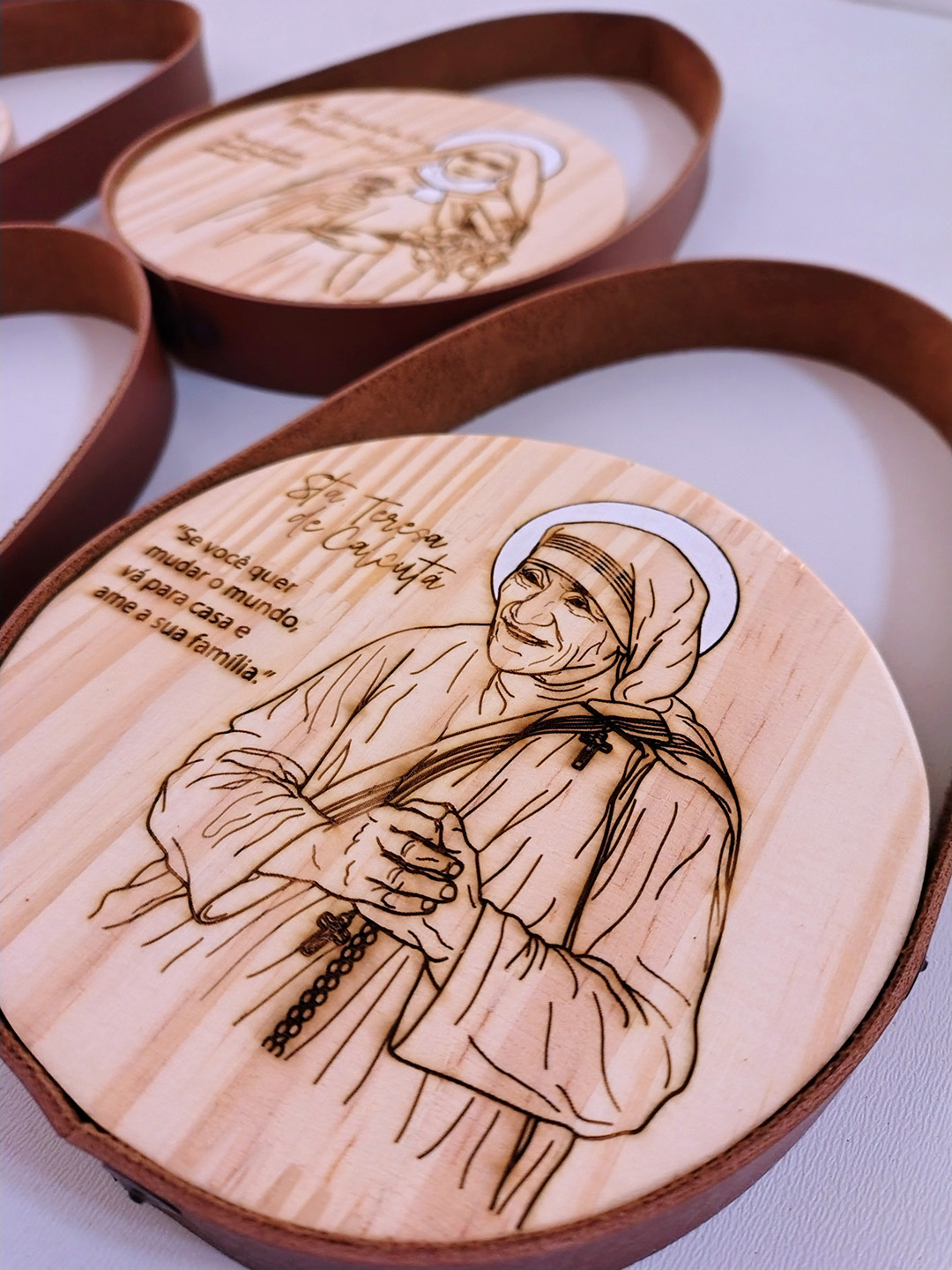 Feito em madeira pinus, com gravação a laser e detalhes delicadamente pintados à mão. Alça em couro sintético, que confere elegante acabamento. Em cada quadro, uma lindíssima frase para refletir e se inspirar. Ideal para presentear e enriquecer sua devoção!