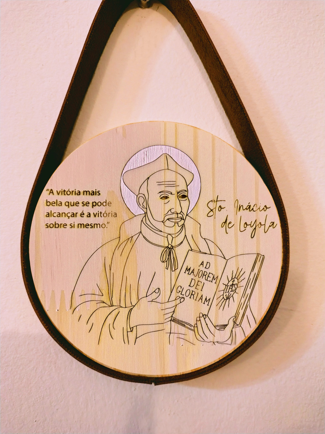 Feito em madeira pinus, com gravação a laser e detalhes delicadamente pintados à mão. Alça em couro sintético, que confere elegante acabamento. Em cada quadro, uma lindíssima frase para refletir e se inspirar. Ideal para presentear e enriquecer sua devoção!